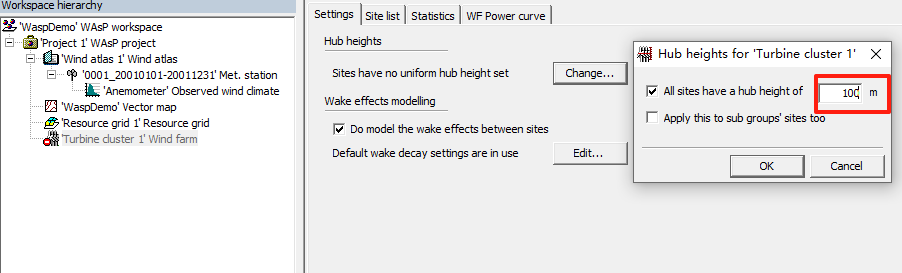 设置轮毂高度,轮毂高度要与测风塔高度一致