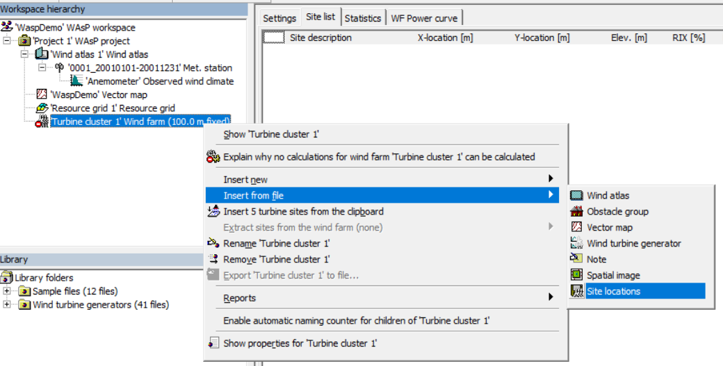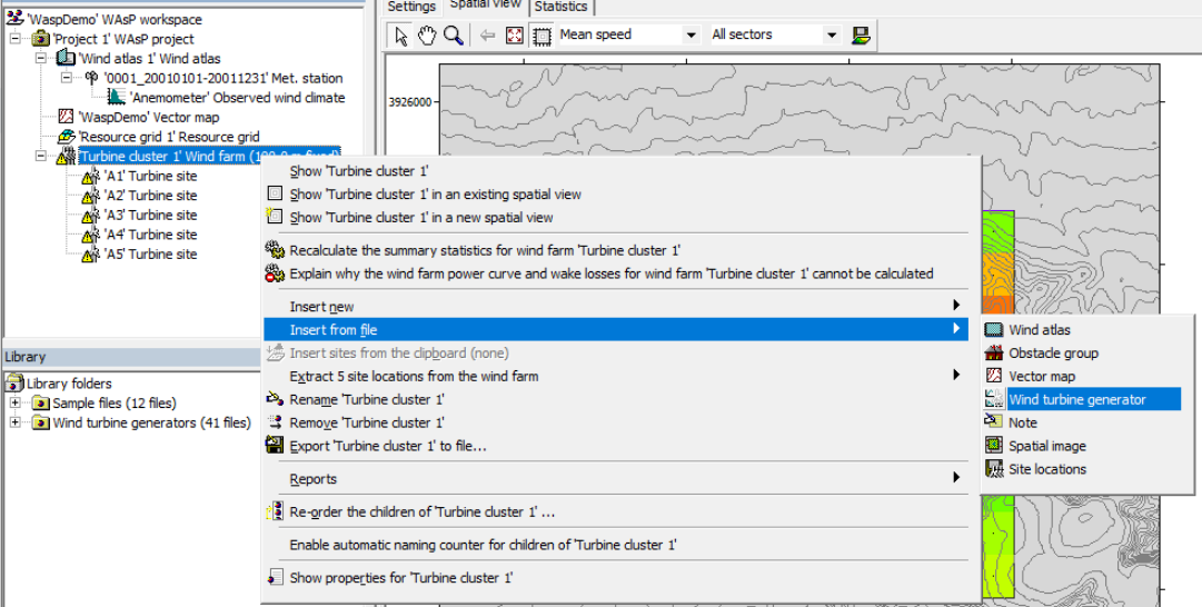 在“Wind farm”右击,选择“Insert from file”,并选择次级菜单“Wind turbine generator”,选择已制作好的风机含功率曲线的风机参数文件
