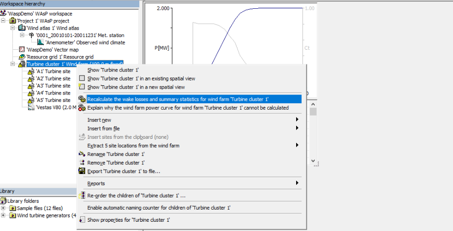 检查计算发电量,右击“Wind farm”,选择“Recalculate...”重新计算检查发电量。