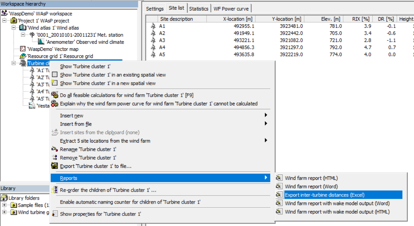 右击“Wind farm”,选择菜单“Reports”,导出适合自己需要的格式。
