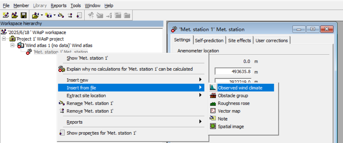 右击“Met. station 1”,选择菜单“Insert from file”,再次选择次级菜单“Observed wind climate”,输入已经准备好的tab格式的测风数据文件
