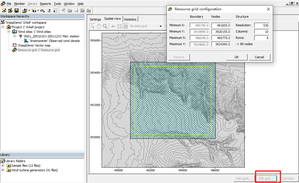 点击右下角的“Edit grid”,再弹出的“Resource grid configuration”中设置,网格的两个顶点坐标、分辨率、列、行,根据实际需要设置。
